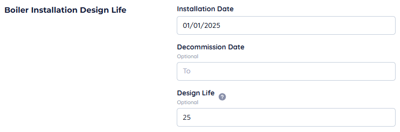 An installation date is required. If neither decommission date nor design life are present, the boiler is considered installed until the end of the simulation.